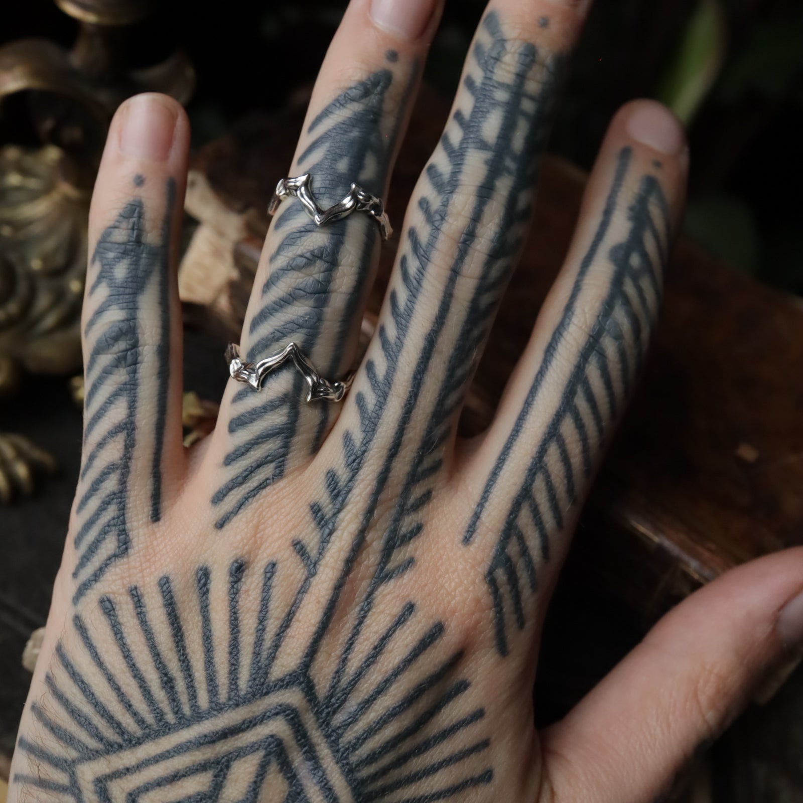 recalling a stem, a vein, or a mineral fragment shaped by time.