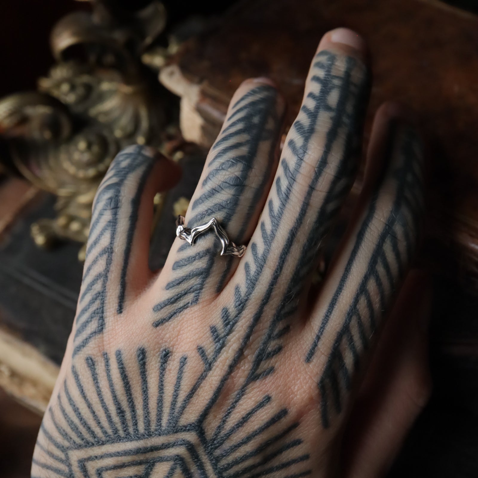 Subtle vegetal reliefs run along the band in an irregular rhythm,